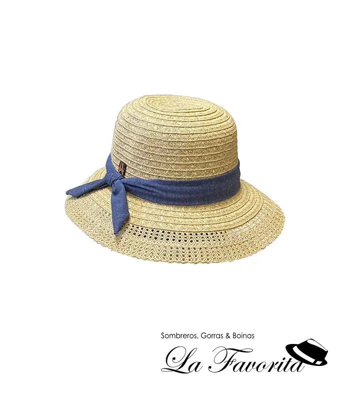 Destaca su lazo decorativo en color azul, un detalle que aporta un toque alegre y elegante, haciendo de este sombrero una pieza atractiva y fácil de combinar.